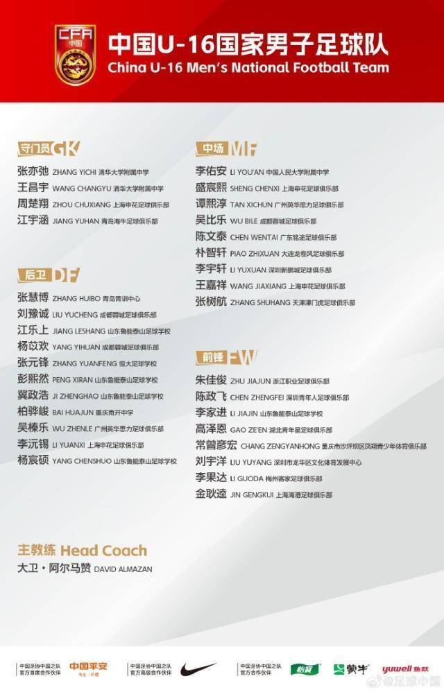 前卫:朱佳俊(浙江队)、陈政飞(深圳后生东说念主)、李家进(山东鲁能泰山足校)、高泽恩(湖北后生星)、常曾彦宏(重庆市沙坪坝区凤翔青少年体育俱乐部)、刘宇洋(深圳市龙华区文化体育发展中心)、李果达(梅州客家)、金耿逵(上海海港)